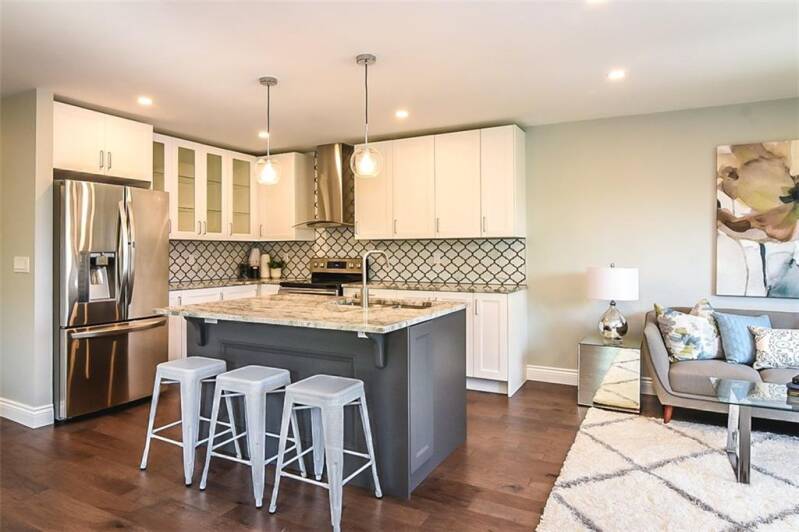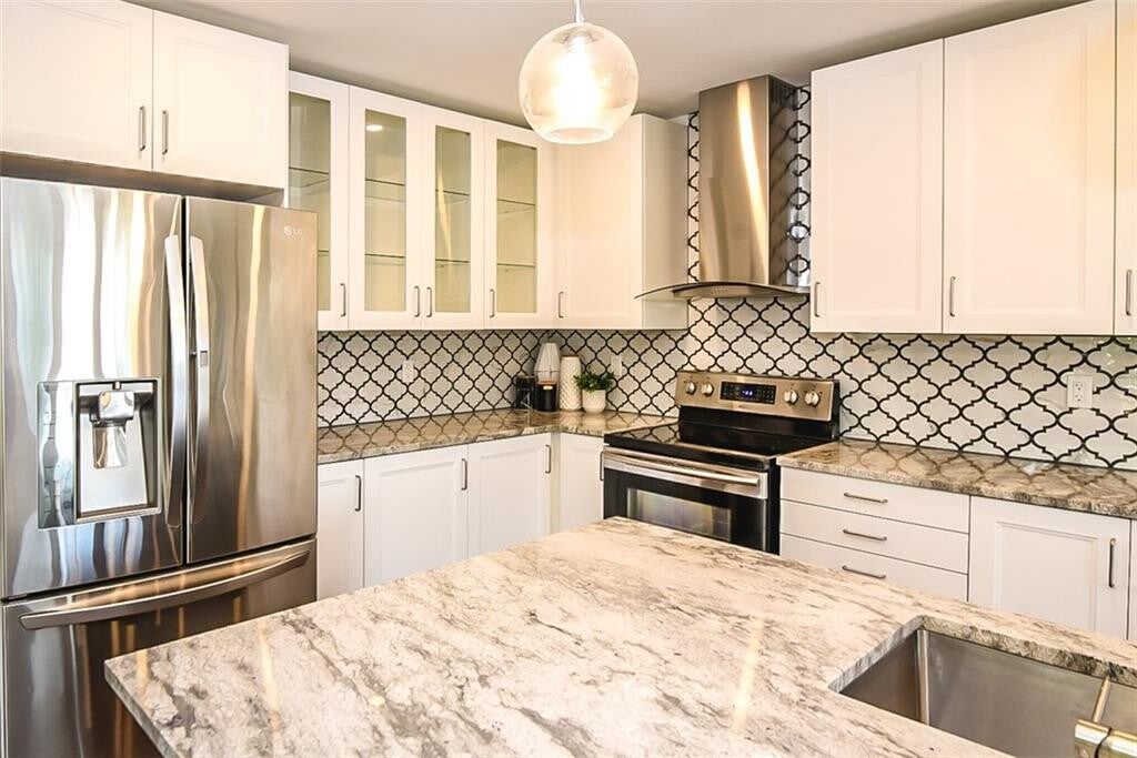 With this kitchen we moved it to a more usable place. New engineered 6 inch plank floors, new ceramic backsplash, ikea cupboards, custom island and a granite counter top.